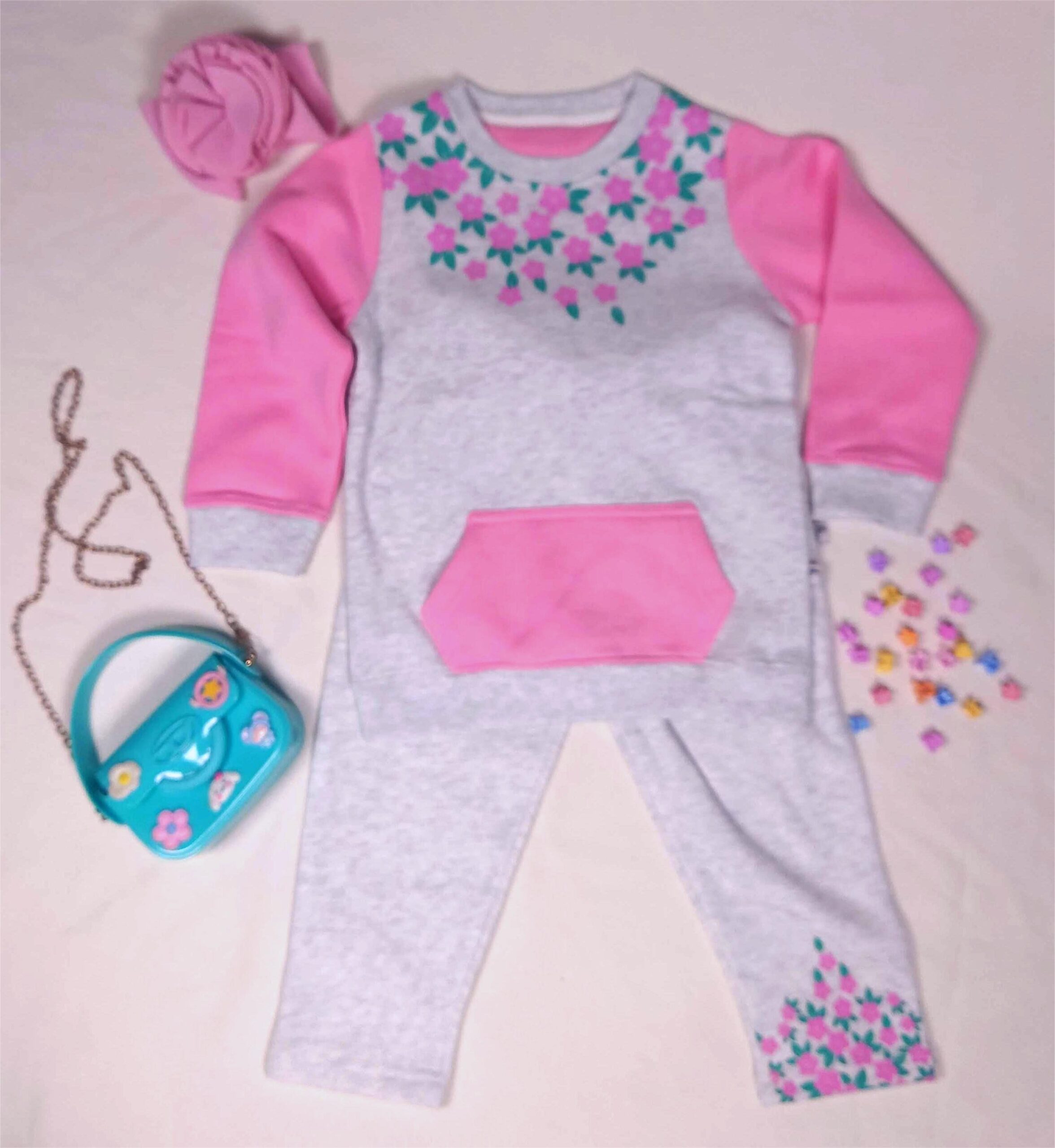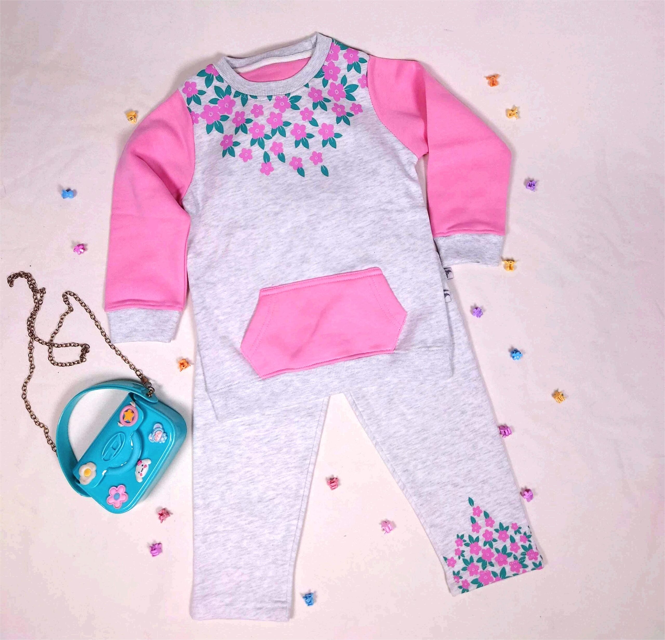 A Beautiful Co-ord set in light grey and pink for girls, with printing embellishment on sweats and trousers. This is designed in comfiest LSF Fleece to let your kids cherish the cold winter.